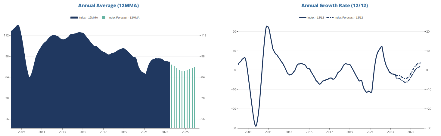 US Primary Metals Production will continue in phase D through Q2 2024 giving way to phase A in Q3 2024. Phase A or “Recovery” occurs when the annual growth rate (12/12) is rising, but the rate of growth is still negative. We denote this phase with blue (for improving).